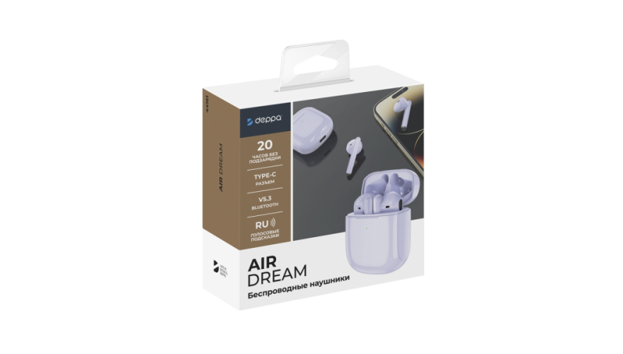 Беспроводные наушники с микрофоном Air Dream от Deppa в оригинальном лаконичном дизайне — это отличное решение для всех, кому нужны компактные Bluetooth-наушники для прослушивания музыки и общения. Наушники оснащены 13-мм динамиками, которые обеспечивают высокое качество звука. Они также поддерживают самый современный на сегодняшний день протокол Bluetooth 5.3, который обеспечивает высокое качество аудиопотока, быстрый переход в активный режим из режима ожидания и низкое энергопотребление. Наслаждаться музыкой можно почти целые сутки: общее время работы наушников с кейсом составляет до 20 часов, а время проигрывания на одном заряде — до 6 часов. После привязки к вашему устройству наушники будут подключаться к нему автоматически, и управлять ими можно при помощи мультисенсора. Кроме того, наушники можно использовать с вашими любимыми голосовыми помощниками. В комплект с наушниками входит зарядный кейс, кабель Type-C для зарядки и руководство пользователя.