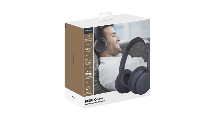 Беспроводные накладные наушники Stereo Max от Deppa — это отличный выбор для настоящих меломанов. Наушники оснащены 40-мм динамиками, которые обеспечивают объемный звук с насыщенными низкими частотами, а чувствительность составляет 100 +- 3 дБ. Они также поддерживают самый современный на сегодняшний день протокол Bluetooth 5.3, который обеспечивает высокое качество аудиопотока, быстрый переход в активный режим из режима ожидания и низкое энергопотребление. Наушники оснащены зарядным портом Type-C и поддерживают быструю зарядку: 5 минут зарядки дают вам 10 часов непрерывной работы наушников. Мягкие амбушюры не только комфортно сидят на ушах, но и обеспечивают качественное пассивное шумоподавление. Складная конструкция наушников остается надежной благодаря металлическому оголовью. Кроме того, наушники можно использовать как проводные. В комплект с наушниками входит зарядный кабель Type-C, AUX-кабель (1 м) и руководство пользователя.