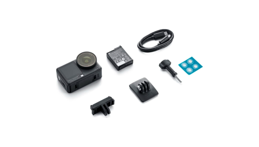 Комплектация Standard Combo включает всё необходимое для старта: камеру, аккумулятор Extreme Battery Plus, изогнутую клейкую базу, заблокировочный винт, USB‑C PD‑кабель, антискользящую подушку и наклейку с логотипом.