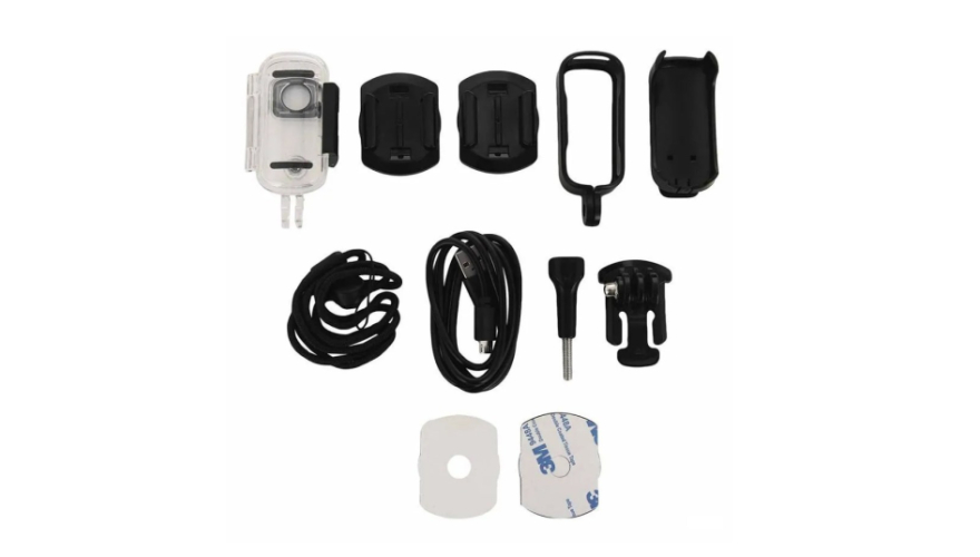 В комплекте все необходимые аксессуары: крепления крепление-защелка, площадка изогнутая клеящаяся, площадка ровная клеящаяся, 2 шт. - скотч двусторонний для креплений, страховочный шнур, кабель USB - Type-C, подводный бокс, инструкция.