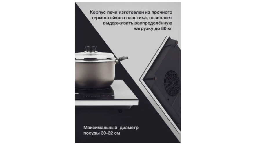 Корпус печи изготовлен из прочного термостойкого пластика, позволяет выдерживать распределённую нагрузку до 80 кг. Цельная поверхность класса А изготовлена из стеклокерамики. На панели управления расположены сенсорные кнопки и 4-разрядный дисплей. Длина шнура составляет 2 метра.