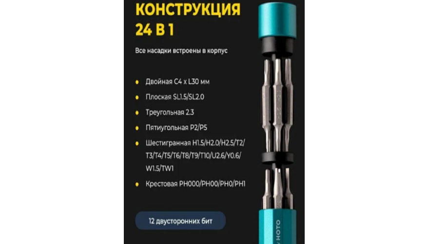 24 предмета в наборе: В набор входит 24 предмета, среди которых биты с различными типами наконечников: крестообразные, прямые, трехлопастные, шестиугольные, а также с наконечниками Pentalobe и Torx.