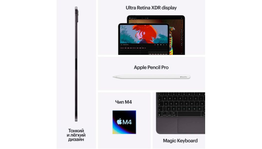 Представляем M4, кремний Apple следующего поколения, обеспечивающий потрясающую производительность при исключительно тонком и легком дизайне iPad Pro. Совершенно новый механизм отображения обеспечивает потрясающую точность, цветопередачу и яркость. Мощный графический процессор с аппаратным ускорением трассировки лучей создает графику, меняющую правила игры. А нейронный движок в M4 делает iPad Pro абсолютным двигателем искусственного интеллекта.