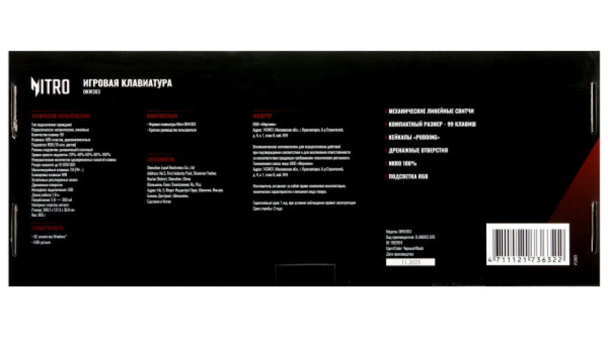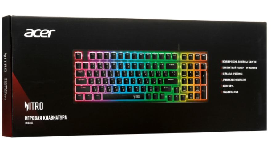 Клавиатура проводная Acer Nitro OKW303 механического типа обеспечит комфортный игровой процесс. Металлический каркас черного цвета дополняют кейкапы из матового белого пластика с внутренней RGB-подсветкой, которую можно настраивать. Это придает оригинальности клавиатуре и создает атмосферу драйва во время игр. Линейные переключатели обеспечивают жизненный цикл клавиш в пределах 10 млн. нажатий. Защита от попадания воды внутрь предупреждает преждевременное повреждение клавиатуры.