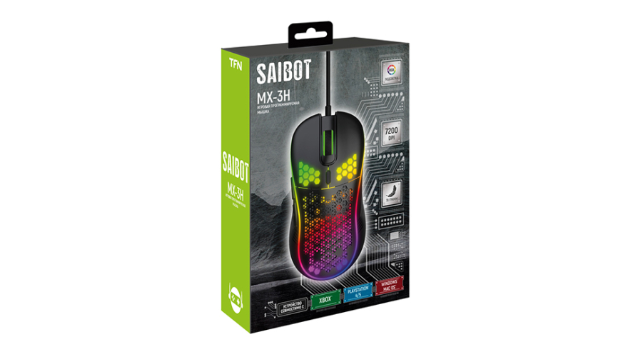 Мышь TFN Saibot MX-3H имеет высокопроизводительный оптический сенсор, максимальное оптическое разрешение которого 7200 DPI. Предусмотрены смена разрешения, яркая RGB-подсветка, а так же прочный корпус из ABS пластика с покрытием софт-тач.