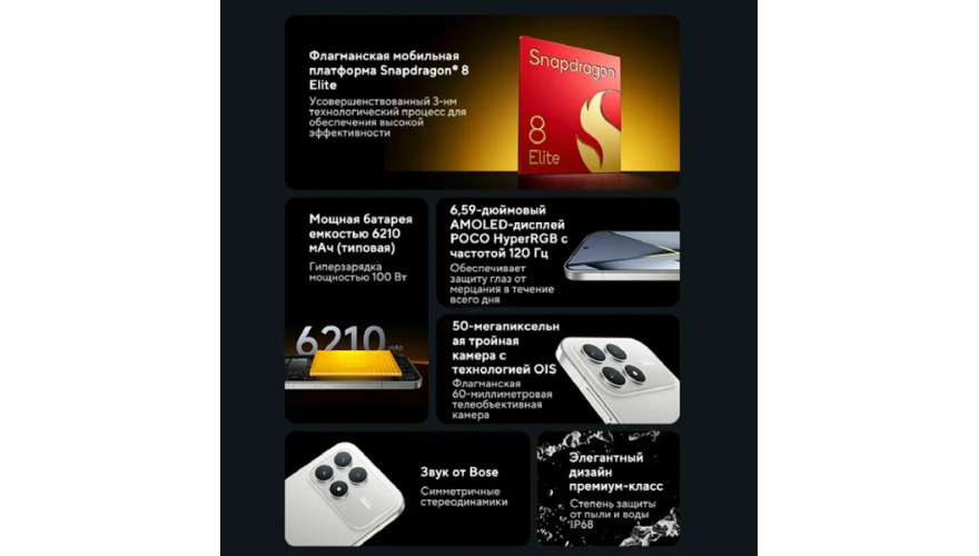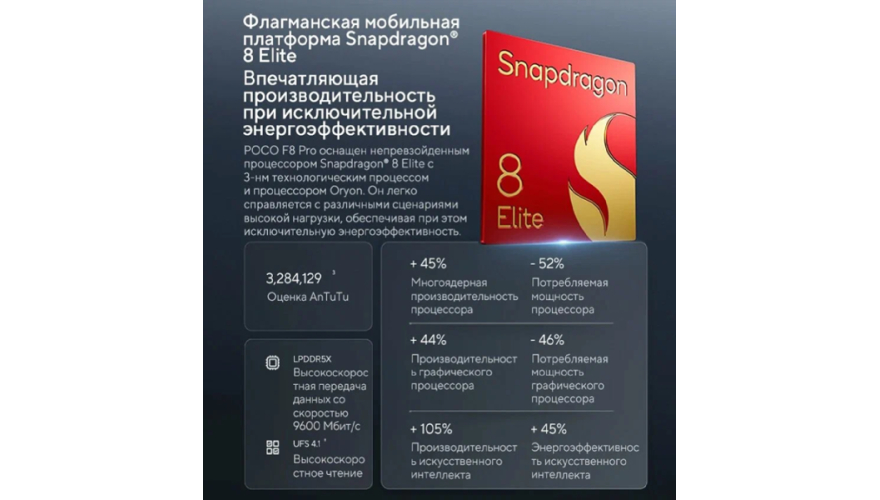 POCO F8 Pro оснащён топовым процессором Snapdragon® 8 Elite, обеспечивающим высочайшую скорость в играх, работе и многозадачности. Большой аккумулятор 6210 мА·ч и поддержка 100 Вт быстрой зарядки позволяют дольше оставаться на связи и быстро восполнять заряд.