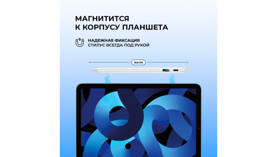 Стилус для планшетов — это универсальный аксессуар, предназначенный для использования с смартфонами, планшетами и другими устройствами с сенсорными экранами. Совместимо с ОС: Android, iOS, Windows. Ручка-стилус для планшета поддерживает до 10 часов непрерывной работы, что позволит пользоваться им без подзарядки. Благодаря LED-экрану вы легко сможете отследить уровень заряда. Магнитное крепление надежно фиксирует стилус к корпусу планшета, это удобно и надёжно. Поддерживает быструю зарядку через Type-C разъём, вы сможете вернуться к работе уже через 30 минут. Прочный корпус из алюминия защищает устройство от повреждений при ежедневном использовании.