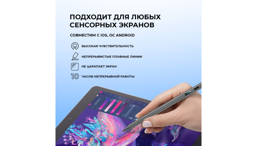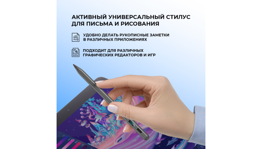 Стилус обеспечивает высочайшую точность и контроль, недоступные при рисовании пальцем. Благодаря поддержке 2048 уровней нажима вы получаете естественную толщину линий — от тончайшего контура до широкого мазка. Специальное покрытие наконечника исключает появление разводов и отпечатков, сохраняя экран идеально чистым.