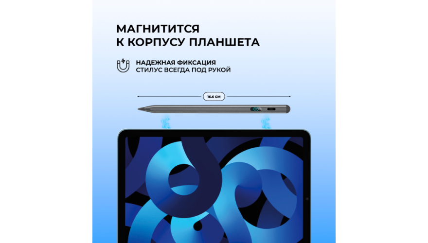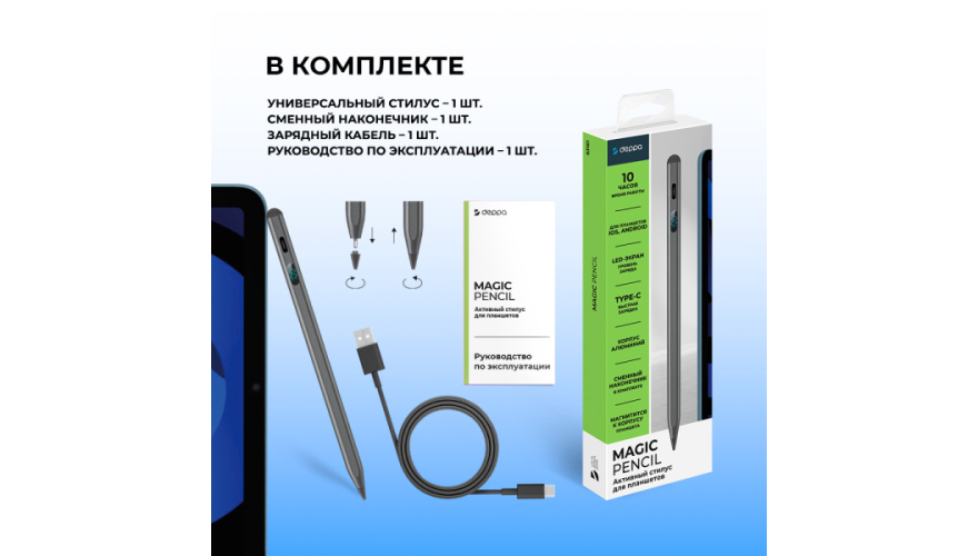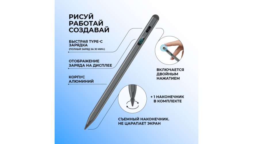 Стилус для планшетов — это универсальный аксессуар, предназначенный для использования с смартфонами, планшетами и другими устройствами с сенсорными экранами. Совместимо с ОС: Android, iOS, Windows. Ручка-стилус для планшета поддерживает до 10 часов непрерывной работы, что позволит пользоваться им без подзарядки. Благодаря LED-экрану вы легко сможете отследить уровень заряда. Магнитное крепление надежно фиксирует стилус к корпусу планшета, это удобно и надёжно. Поддерживает быструю зарядку через Type-C разъём, вы сможете вернуться к работе уже через 30 минут. Прочный корпус из алюминия защищает устройство от повреждений при ежедневном использовании.