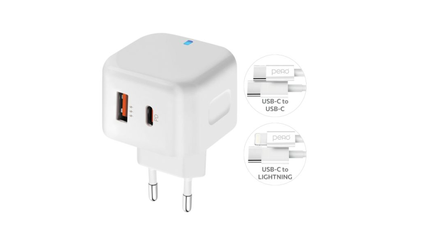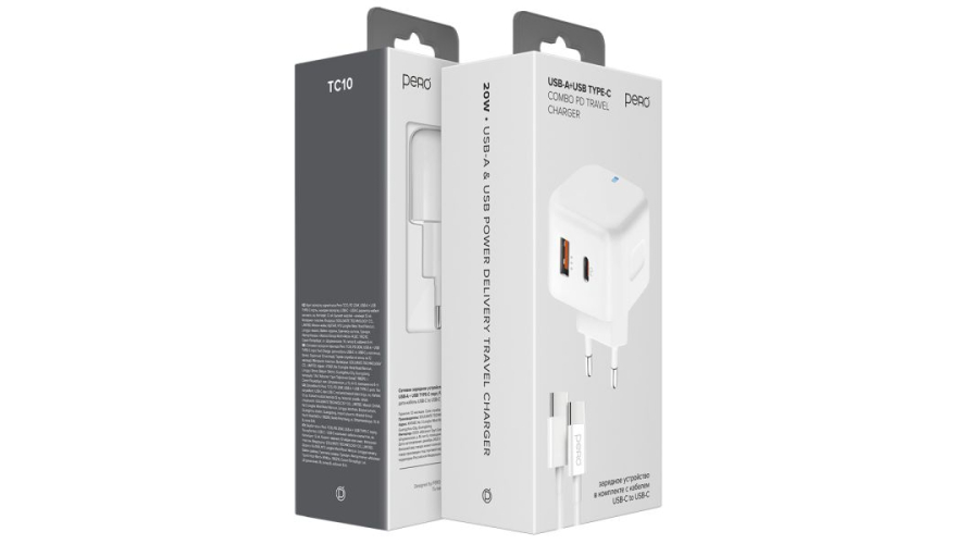 Сетевое зарядное устройство PERO TC10 является универсальным зарядным устройством, которое оснащено двумя USB-портами - одним портом USB-A и одним портом USB Type-C. Порт USB-A может обеспечивать выходной ток до 3.1 А, что позволяет быстро заряжать большинство современных мобильных устройств.
