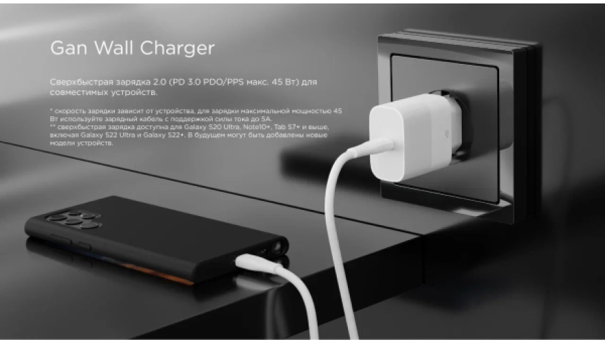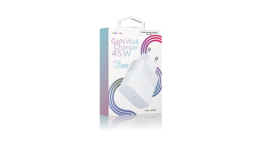 Современное сетевое зарядное устройство в корпусе из огнеупорного пластика обеспечивает безопасный и сверхбыстрый заряд. Максимальная мощность 45 Вт, порт питания - USB-C. Поддерживает актуальные протоколы быстрой зарядки - 2.0 PD 3.0 PDO/PPS. Благодаря технологии GaN адаптер компактнее современных зарядных устройств по размеру, но в разы мощнее. В основе производства СЗУ лежит нитрид галлия, который позволяет повысить энергоэффективность и снизить тепловыделение.