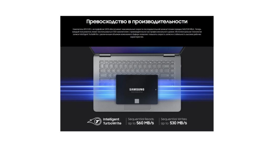 Накопитель 870 EVO с интерфейсом SATA обеспечивает максимальные скорости последовательной записи/чтеним порядка 560/530 MБ/с. Теперь каждый пользователь может воспользоваться SSD накопителем с производительностью профессионального уровня. Интеллектуальная технология записи Intelligent TurboWrite с увеличенным объемом изменяемого буфера позволяет повысить скорость записи и стабильность высоких рабочих характеристик.