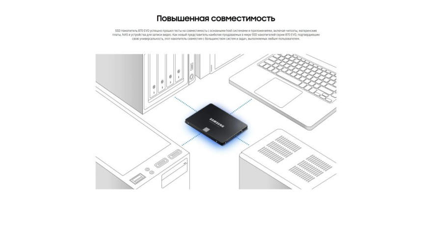 Накопитель 870 EVO создан на основе технологии Samsung, используемой в производстве SSD. Он отличается более высокой производительностью, надежностью и совместимостью, отвечает всем требованиям любого создателя контента, IT профессионалам и обычным пользователям.