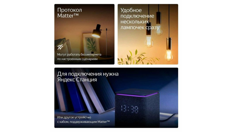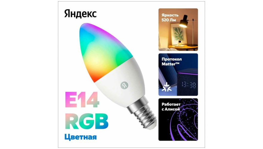 Лампочка работает с протоколом Matter over Wi-Fi, что позволяет интегрировать её в умный дом и использовать настроенные сценарии даже при отсутствии интернета. Для подключения потребуется приложение Дом с Алисой и совместимое устройство с поддержкой Matter, например, Яндекс Станция.