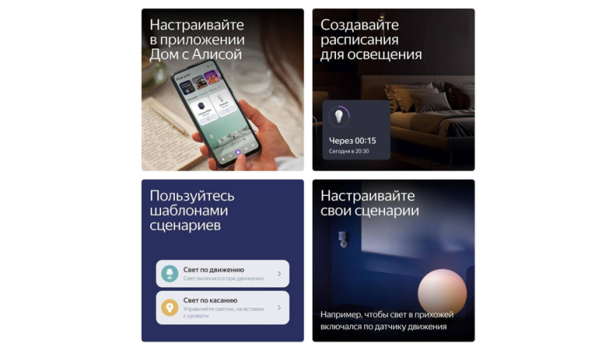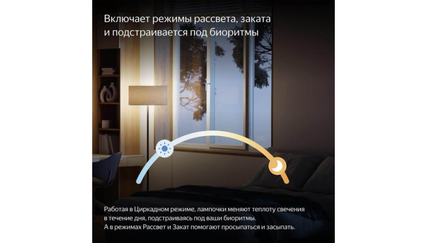 Запускайте специальные режимы освещения. Например, настройте в приложении Дом с Алисой сценарий запуска «Рассвета», и в заданное время утром лампочки начнут постепенно разгораться, плавно меняя свечение от приглушённого тёплого до яркого белого и помогая проснуться