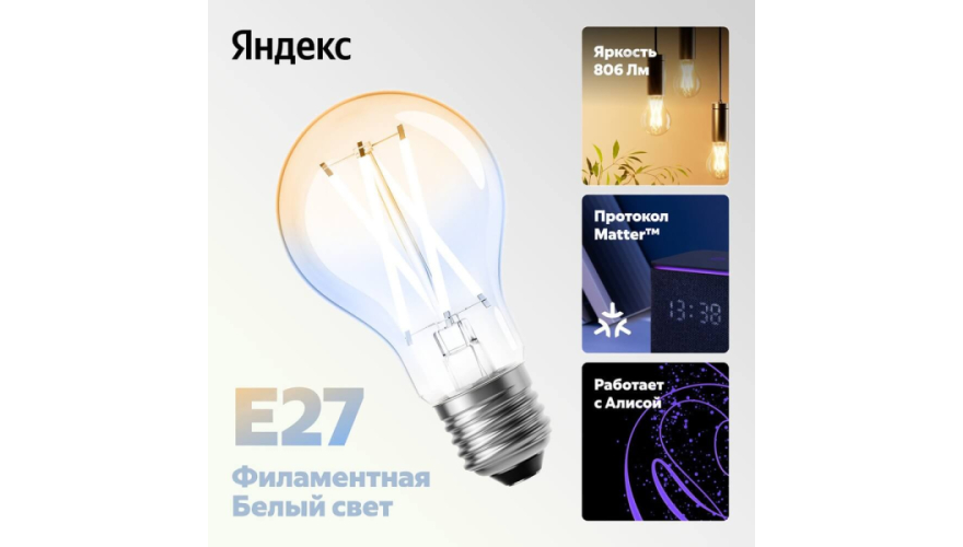 Умная лампочка Яндекса (YNDX-00554) — отличное решение для тех, кто хочет начать создавать систему умного дома, и для тех, кто хочет расширить его функционал. Замените обычные лампы дома умными светодиодными лампочками Яндекса — и вы увидите, каким разным, удобным и функциональным может быть освещение. Филаментная лампочка обладает более равномерным световым потоком, а благодаря своему более классическому виду будет незаменима, когда важна эстетика: для открытых люстр и дизайнерских светильников.
