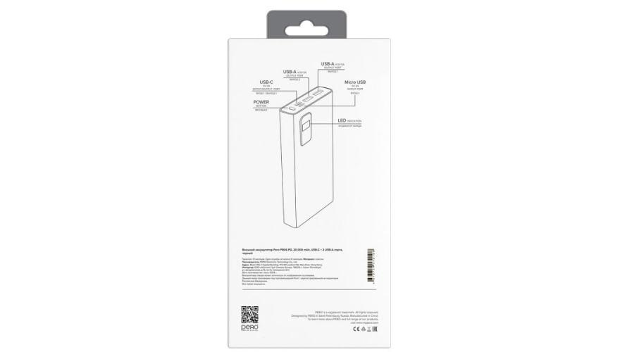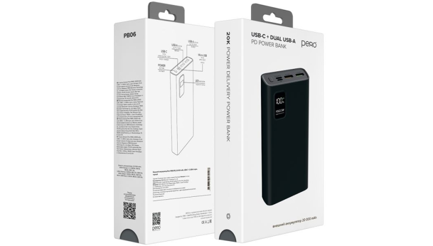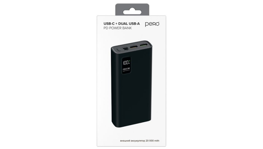 Литий-полимерный внешний аккумулятор PERO PB06 емкостью 20 000 мА·ч оснащен двумя USB-A портами и одним USB-C портом с выходным током 3А. Корпус изделия изготовлен из высокопрочного и качественного пластика, материал устойчив к внешнему воздействию и царапинам. На общей панели есть кнопка включения и LED-индикаторы на внешней части аккумулятора, которые уведомляют о уровне заряда батареи.
