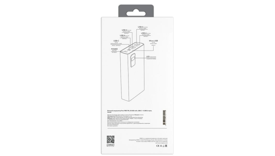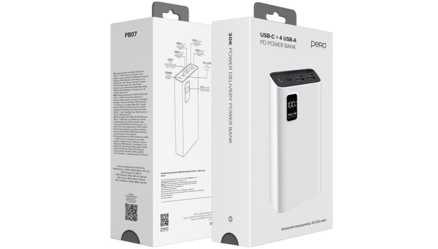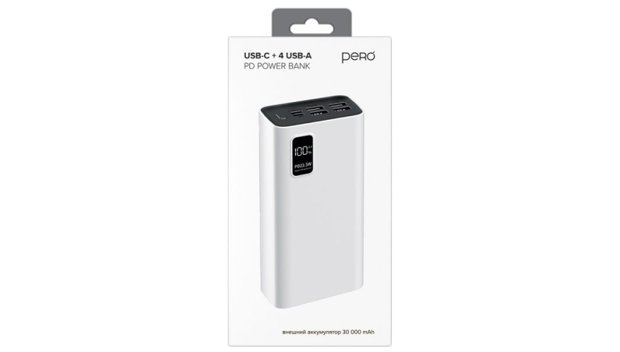 Литий-полимерный внешний аккумулятор PERO PB07 емкостью 30 000 мА·ч оснащен четырьмя USB-A портами и одним USB-C портом с выходным током 3А. Корпус изделия изготовлен из высокопрочного и качественного пластика, материал устойчив к внешнему воздействию и царапинам. На общей панели есть кнопка включения и LED-индикаторы на внешней части аккумулятора, которые уведомляют о уровне заряда батареи.